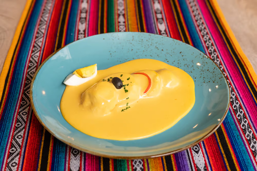 patate con salsa huancaina (aji amarillo, formaggio, latte, cracker), uovo, oliva