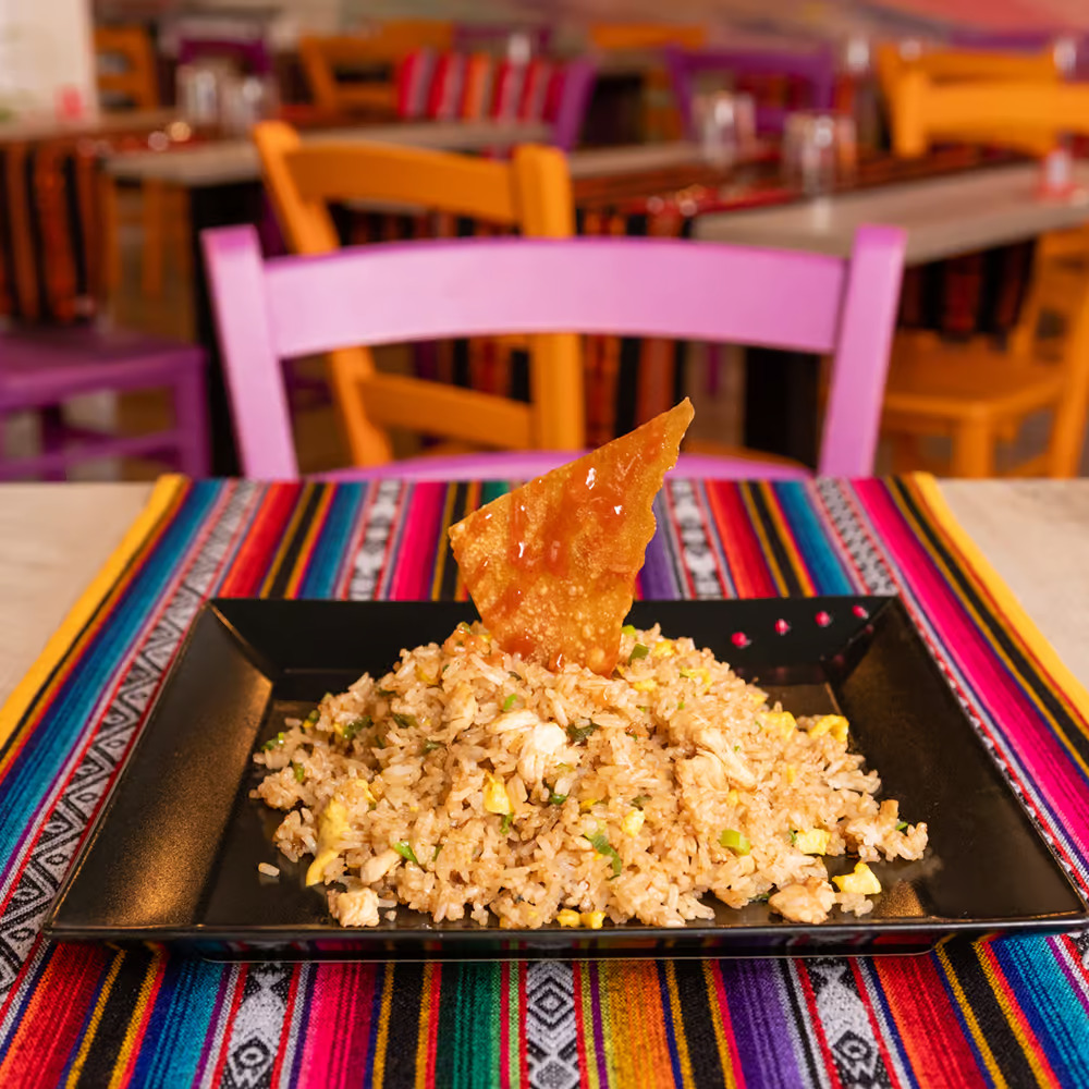 riso al salto con frittata, peperone, carote, zucchine, salsa di soia, olio di sesamo. contorno: wanton fritto