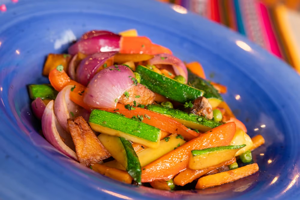 verdura al salto (zucchine, carote, patate, cipolla, peperone, maiz peruviano, broccoli, funghi champignon) vino bianco, aglio, olio di oliva